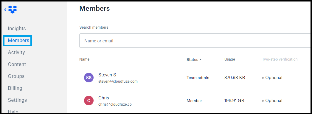 Upon accessing the admin dashboard, you will be shown a set of features and controls to manage the Dropbox account. Locate Members section on the left navigation menu and click on it.
