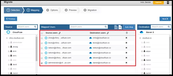 CloudFuze has a feature called Auto-Map that automatically pairs users in source and destination based on the email aliases. This feature saves a lot of time and makes the entire migration process smooth. In case, if you need to transfer data between different users, it can be done using the CSV feature.