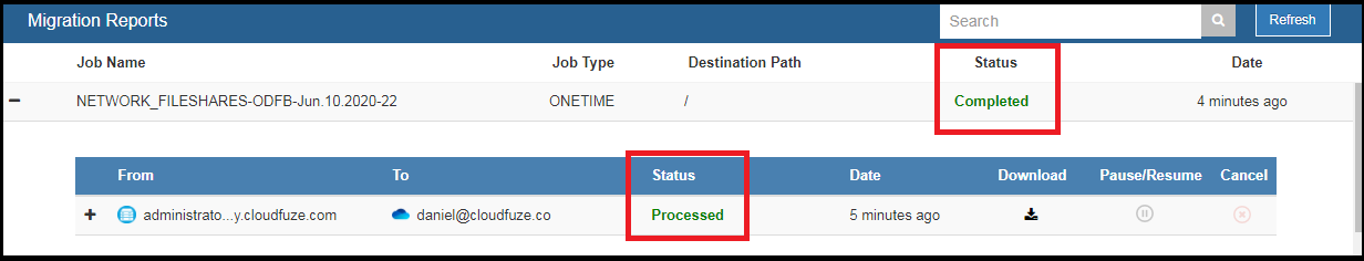 Now, the status shows as In-Progress as the file migration between Network File Shares and cloud (OneDrive) is in process.