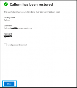 Once you click on the Restore User link, a popup will be opened with few options to choose from. Select an Auto-generate password or you can create a password by selecting appropriate radio buttons. Tick mark the last option where a user will be asked to change their password upon first sign-in.