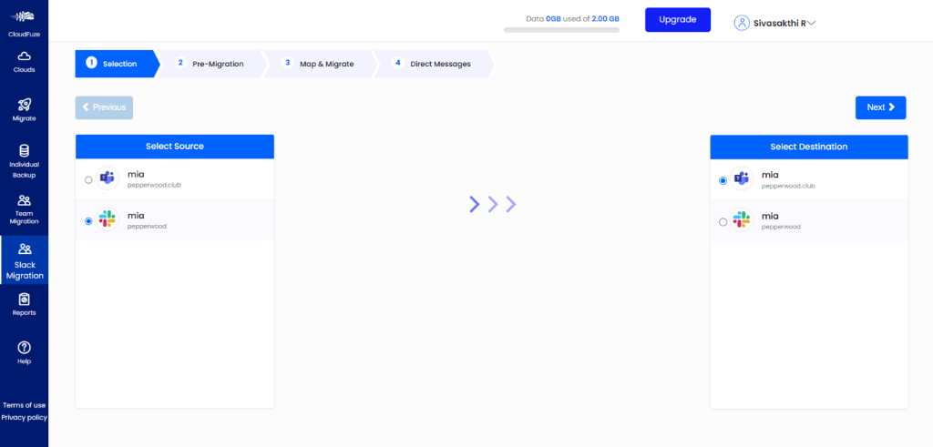 The process of migrating Slack DMs along with formats and images with CloudFuze is straightforward. It starts with configuring Slack as the source and Microsoft Teams as the destination cloud in the CloudFuze webapp.