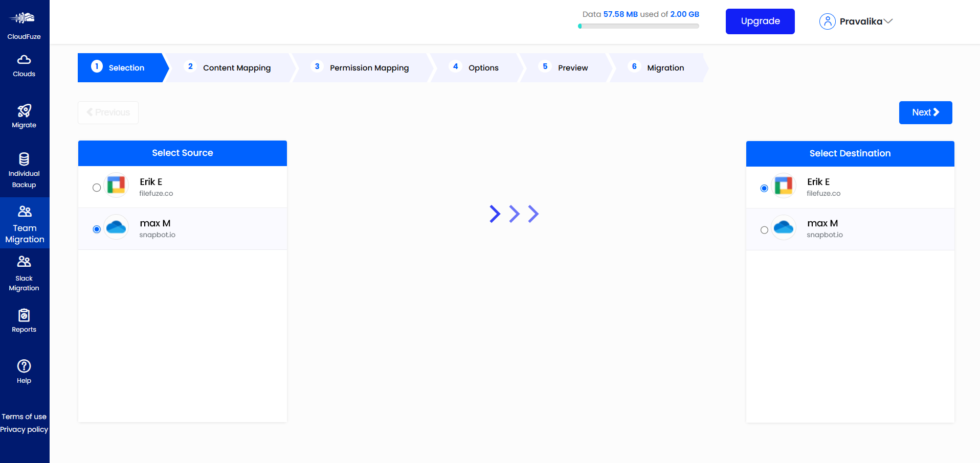 Click on “Team Migration” on the left panel. Next, select OneDrive as the source and Google Drive as the destination cloud. Click on “Next.”