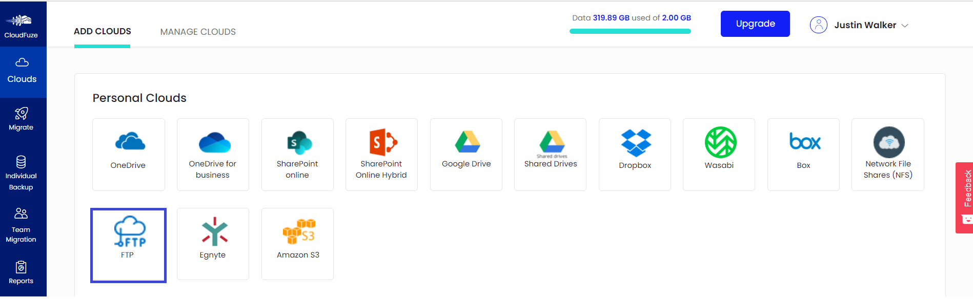 Once FTP has been added, click on the Clouds icon and go to the Manage Clouds tab. You should be able to find the newly added FTP account there.