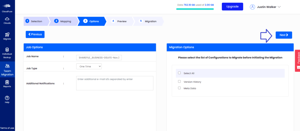 You can choose other options like job type, additional notifications, etc. You can also give a custom migration job name. This is particularly useful when you run multiple migrations parallelly.