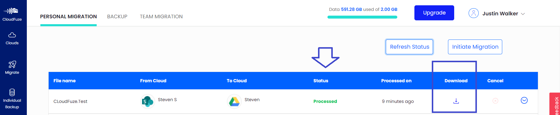 When the migration is completed, the status will show as Processed. Once the migration is completed, you can download the migration report by clicking on the download icon.