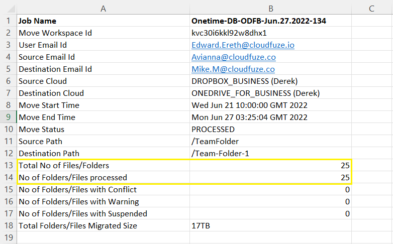 Here is an example of the details of each migrated file and folder in the data migration report of a Dropbox to OneDrive for Business migration: